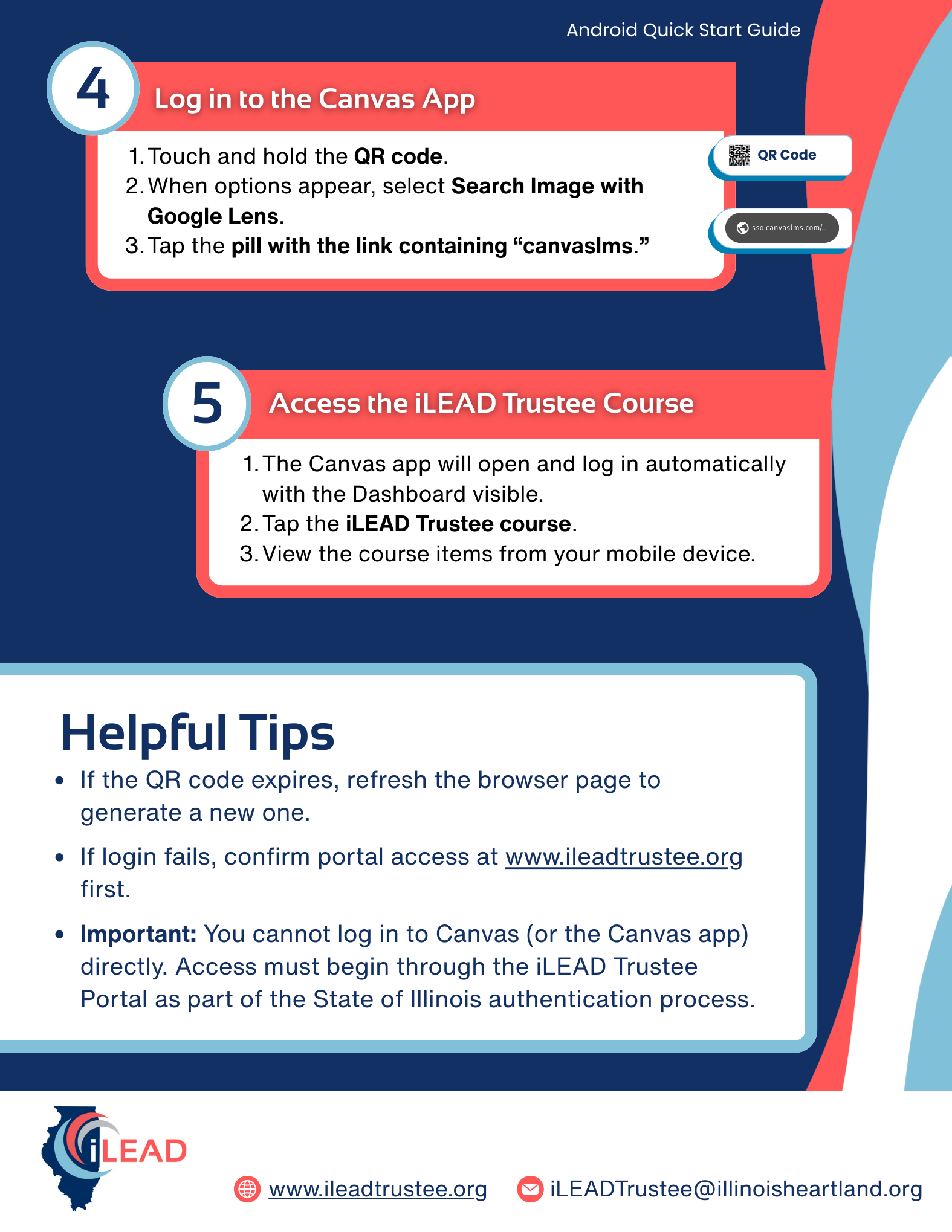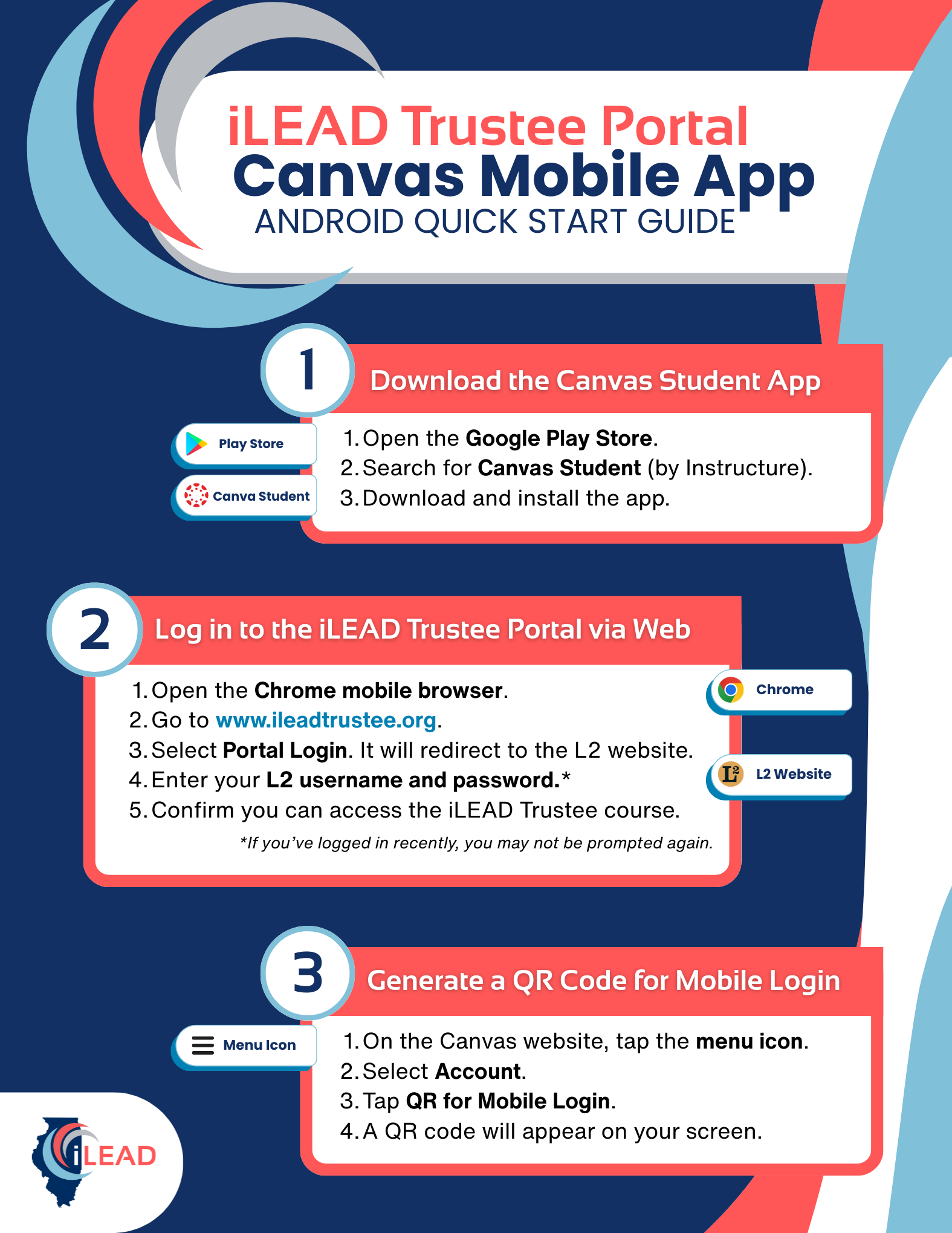 Important: You cannot log in to Canvas (or the Canvas app) directly. Access must begin through the iLEAD Trustee Portal as part of the State of Illinois authentication process.
